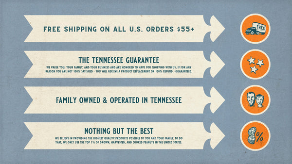 IN 2019 JAY CLEVELAND AND FAMILY BEGAN OPERATING TENNESSEE PEANUT RIGHT HERE IN NASHVILLE, TENNESSEE. WHEN YOU BUY FROM TENNESSEE PEANUT COMPANY, YOU ARE INVESTING INTO A FAMILY. JAY ALWAYS DREAMED OF OFFERING WHOLESOME PRODUCTS FROM ONE FAMILY TO ANOTHER. WE'RE SO GRATEFUL FOR YOU TO ALLOW US THAT OPPORTUNITY.