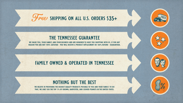 IN 2019 JAY CLEVELAND AND FAMILY BEGAN OPERATING TENNESSEE PEANUT RIGHT HERE IN NASHVILLE, TENNESSEE. WHEN YOU BUY FROM TENNESSEE PEANUT COMPANY, YOU ARE INVESTING INTO A FAMILY. JAY ALWAYS DREAMED OF OFFERING WHOLESOME PRODUCTS FROM ONE FAMILY TO ANOTHER. WE'RE SO GRATEFUL FOR YOU TO ALLOW US THAT OPPORTUNITY.